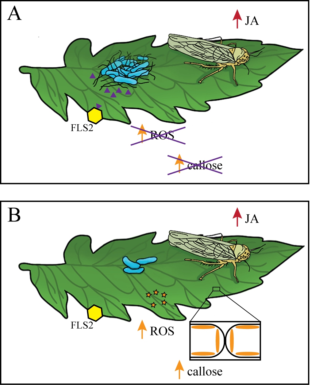 Below is her model describing the link between the bacterial flagellum and the positive effects of leafhopper infestation on S. enterica persistence. (A) Leafhopper infestation leads to increased populations of flagellated S. enterica (blue) on the leaf surface. Leafhopper-induction of the JA response (red) in combination with recognition of extracellular S. enterica flg22 peptides (purple triangles) by FLS2 (yellow hexagon) inhibit ROS activation and callose deposition. (B) Although leafhoppers induce the JA response (red), non-flagellated S. enterica populations (blue) decline due to activation of ROS activation (orange stars) and callose deposition(Cowles et al., 2018).